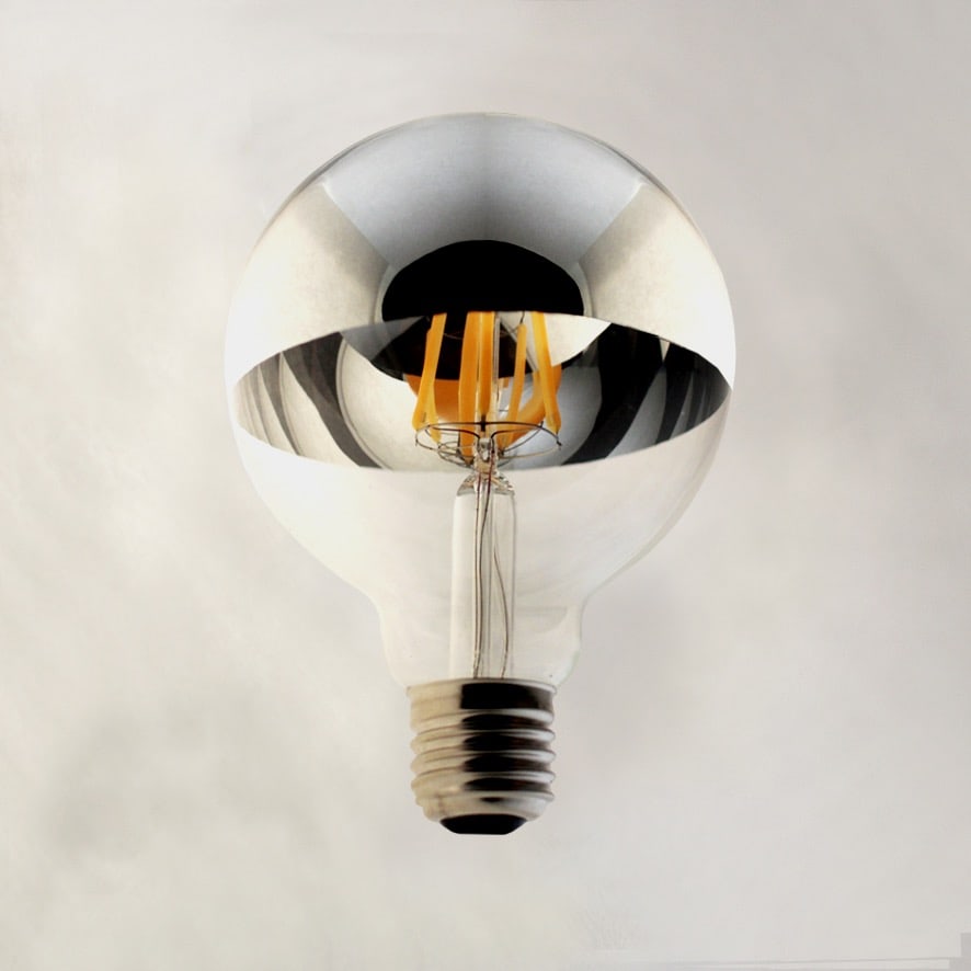 Splendida Lampada Led Globo con metà superficie specchiata, perfetta per valorizzare interni sofisticati, e per evitare il fastidioso accecamento della luce delle lampadine in caso di lampadari o applique con lampadina a vista.
