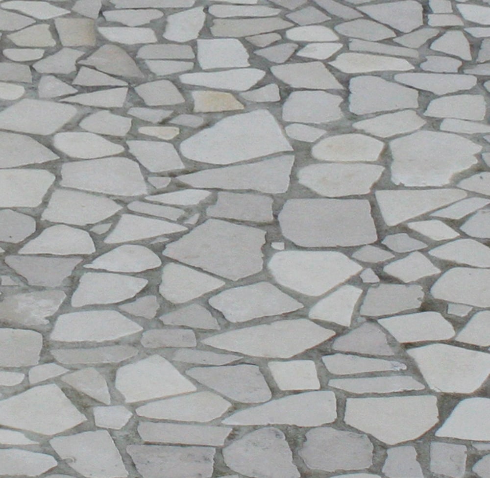 Rivestimento in Palladiana di marmo per interni o per esterni, ideale per cucine in muratura, zoccolature o rivestimenti di pareti composto da elementi irregolari burattati in marmo di Trani di colore chiaro. Spessore 1,5cm, dimensioni contenute in diametri variabili tra 12 ed 8 cm.